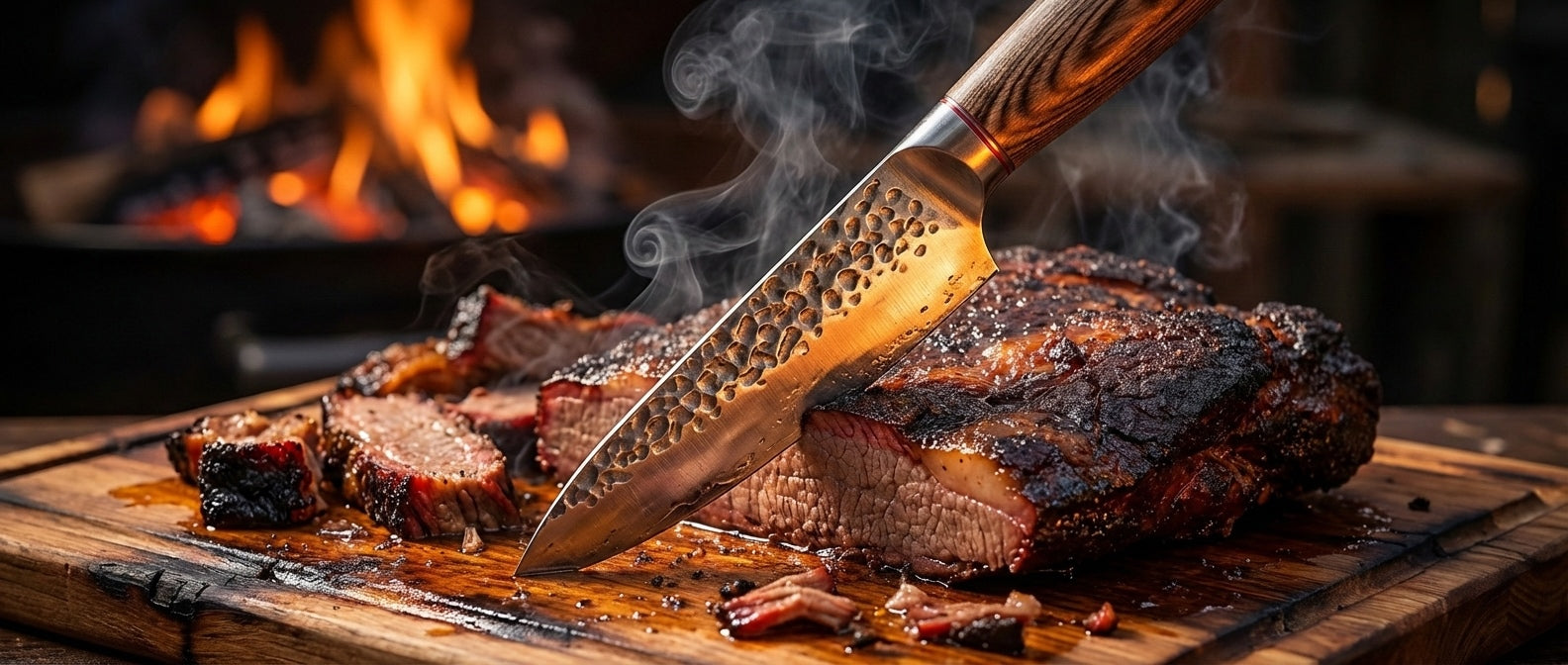 Crafted from high-carbon steel with a traditional hammered finish, the Carbon Savage slices through thick brisket like butter without tearing the meat. Delivered in a premium custom box—the ultimate tool for true pitmasters.